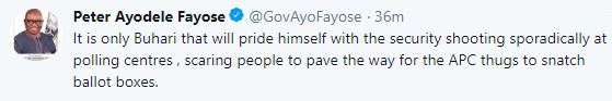 In a series of tweets on Monday, he accused President Muhammadu Buhari of using the security operatives to win the poll for the All Progressives Congress (APC) and their candidate, Dr Kayode Fayemi.