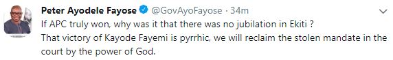 “We will reclaim the stolen mandate in the court by the power of God,” Fayose vowed. “As for me, I am Peter Ayodele Fayose, I hold with my head high.”