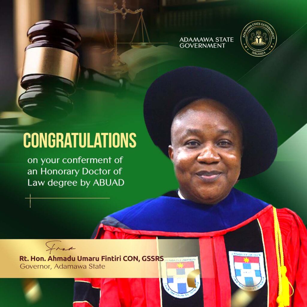 Governor Ahmadu Umaru Fintiri of Adamawa State has congratulated Damian Dodo, a legal luminary, on receiving a Doctor of Law (Honoris Causa) from Afebabola University in Eikiti State in recognition of his outstanding contributions to the advancement of the legal profession both at home and abroad.